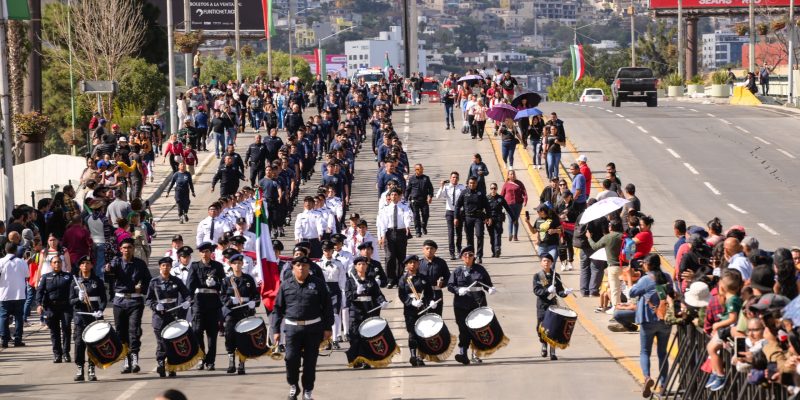 Posterior al acto cívico conmemorativo, la alcaldesa de Tijuana e integrantes de su gabinete, desde el balcón presidencial observaron el desfile cívico militar donde participaron 100 contingentes entre elementos de la Secretaría de Seguridad y Protección Ciudadana Municipal (SSPCM), Secretaría de la Defensa Nacional (SEDENA), Dirección de Bomberos, Dirección de Protección Civil, Cruz Roja Tijuana, sector educativo, así como asociaciones civiles y paramilitares.