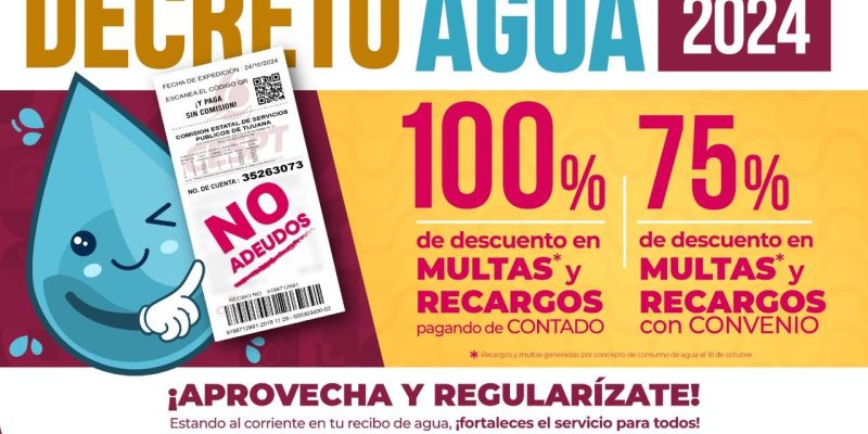TIJUANA.- La Comisión Estatal de Servicios Públicos de Tijuana (CESPT) anunció la entrada en vigor del decreto de condonación de multas y recargos para usuarios de uso doméstico y no doméstico, que por consumo de agua se hayan generado con anterioridad a su entrada en vigor; el 18 de octubre de 2024, mismo que se mantendrá vigente hasta el 13 de diciembre del 2024.