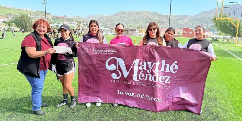 Tecate, B. C. 2025.- El equipo de flag fútbol de Tecate, Pink Panthers recibió la visita de la Dip. Maythé Méndez, precisamente en las instalaciones del Campo del Mayab, mientras realizaban su entrenamiento.