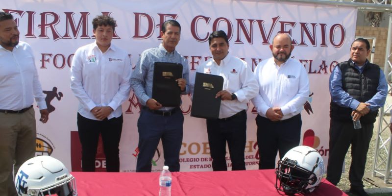 El convenio fue firmado, además del titular del INDE BC, por el director general del Colegio de Bachileres, Juan Carpio, y el presidente de la Asociación Estatal de Fútbol Americano, Luis Romero.