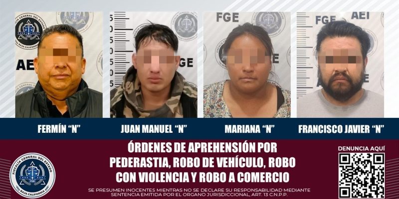 TIJUANA, BAJA CALIFORNIA, A 27 DE NOVIEMBRE DE 2023.- La Fiscalía General del Estado, a través de la Agencia Estatal de Investigación, logró cumplimentar cuatro órdenes de aprehensión contra tres hombres y una mujer, quienes eran requeridos por jueces de control en Tijuana.