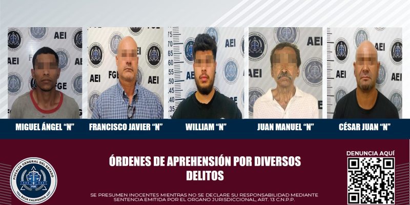TIJUANA, BAJA CALIFORNIA, A 26 DE SEPTIEMBRE DE 2023.- En continuidad con las acciones de investigación en la persecución de los delitos, la Fiscalía General del Estado mediante labor de la Agencia Estatal de Investigación (AEI), cumplimentó cinco órdenes de aprehensión por diversos ilícitos; en uno de los casos, se detuvo a una persona con un mandamiento judicial activo en el estado de Sonora.