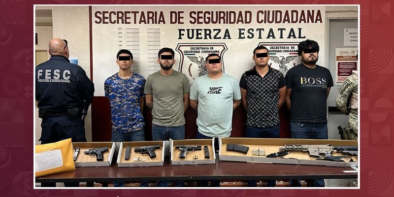 MEXICALI.- Como resultado de un recorrido de prevención y vigilancia que se implementaba en coordinación con elementos de la Secretaría de la Defensa Nacional (SEDENA), cinco hombres originarios del municipio de Mexicali, fueron detenidos en flagrancia en poder de armas de fuego de diferentes calibres y varios envoltorios con la droga metanfetamina.