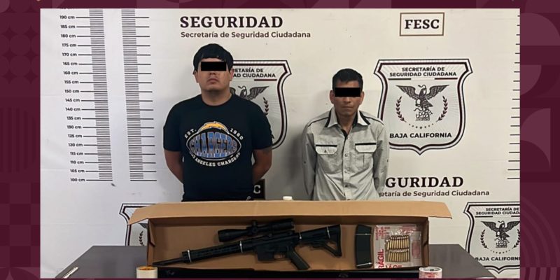 TIJUANA.- Agentes de la Fuerza Estatal de Seguridad Ciudadana (FESC) adscritos a la Secretaría de Seguridad Ciudadana de Baja California (SSCBC) realizaron la detención de dos hombres de 44 y 30 años de edad respectivamente, después de que fueran sorprendidos en poder de un fusil de asalto abastecido con 20 cartuchos útiles; ambos sujetos viajaban a exceso de velocidad sobre la Carretera Libre Tijuana – Tecate.