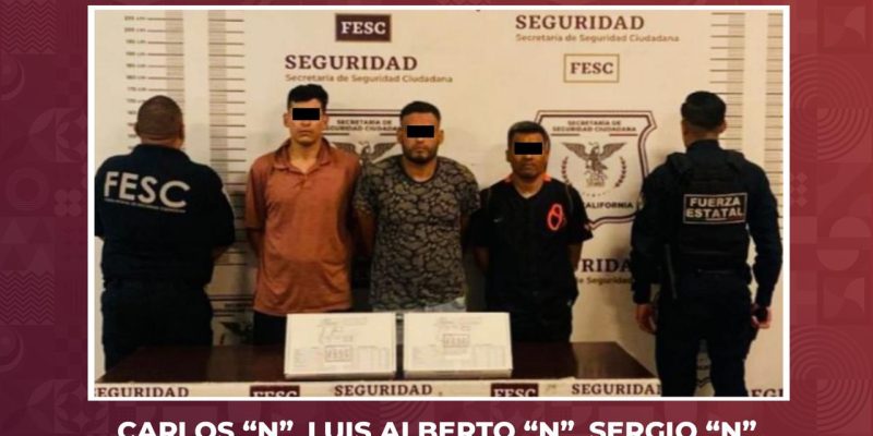 Debido a lo anterior, a Carlos “N”, de 30 años y originario de Tijuana, Luis Alberto “N”, de 31 años y originario de Los Mochis, Sinaloa y Sergio “N”, de 30 y originario de Culiacán, Sinaloa, se les colocaron candados reductores de movilidad en las manos y al mismo tiempo se le dio lectura a la cartilla de sus derechos constitucionales.