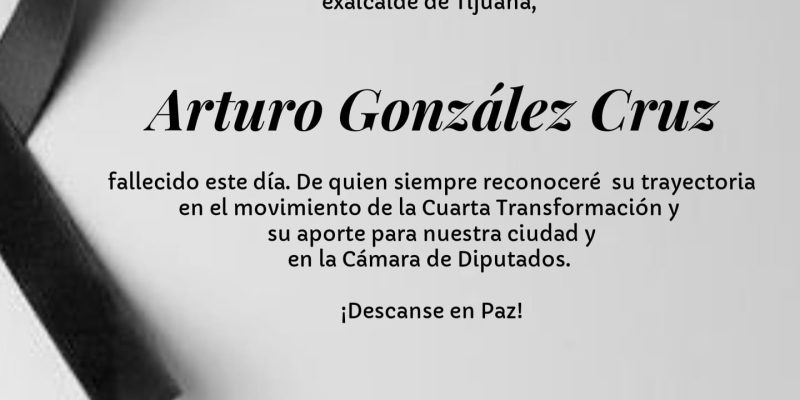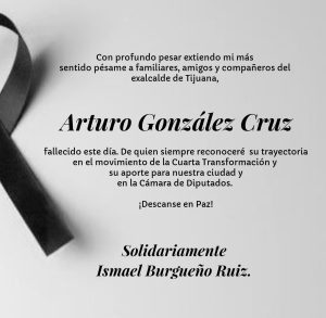 Sentidas Condolencias por el fallecimiento del Sr. Arturo González Cruz, Primer Alcalde de morena en la ciudad fronteriza de Tijuana.