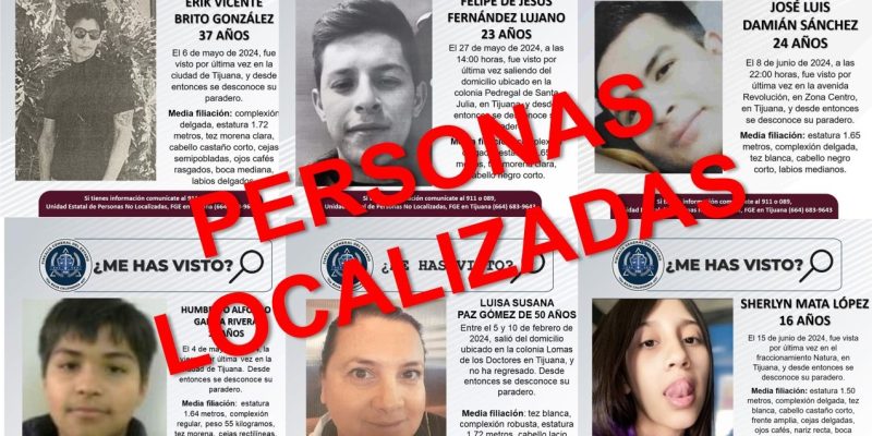 Las personas localizadas son: Erik Vicente Brito González de 37 años, Felipe de Jesús Fernández Lujano de 23 años, José Luis Damián Sánchez de 24 años de edad, Humberto Alfonso García Rivera de 15 años, Sherlyn Mata López de 16 años y Luisa Susana Paz Gómez de 50 años de edad.