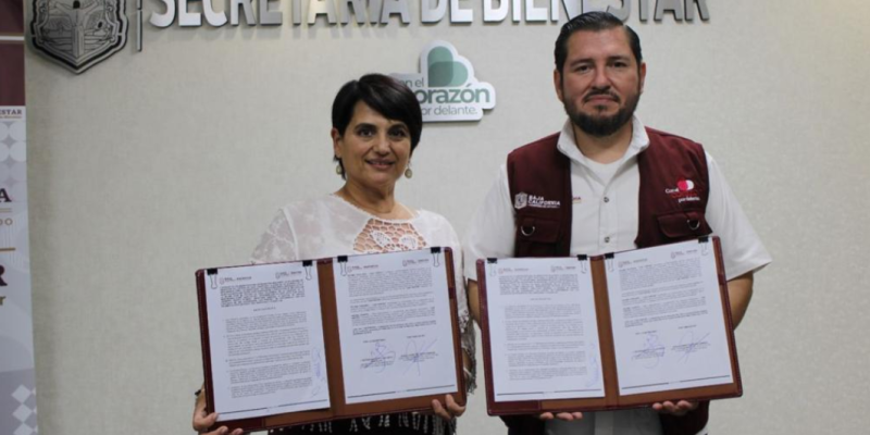 MEXICALI.- Con el propósito de brindar atención inmediata a mujeres en situación de violencia y otorgarle el acompañamiento necesario o hacer la referencia a la instancia correspondiente, la directora General del Instituto de la Mujer para el Estado de Baja California (INMUJER), Karla Pedrin Rembao y el secretario de Bienestar, Netzahualcóyotl Jauregui, firmaron un convenio de colaboración para que INMUJER esté presente durante la entrega de la Tarjeta Violeta.