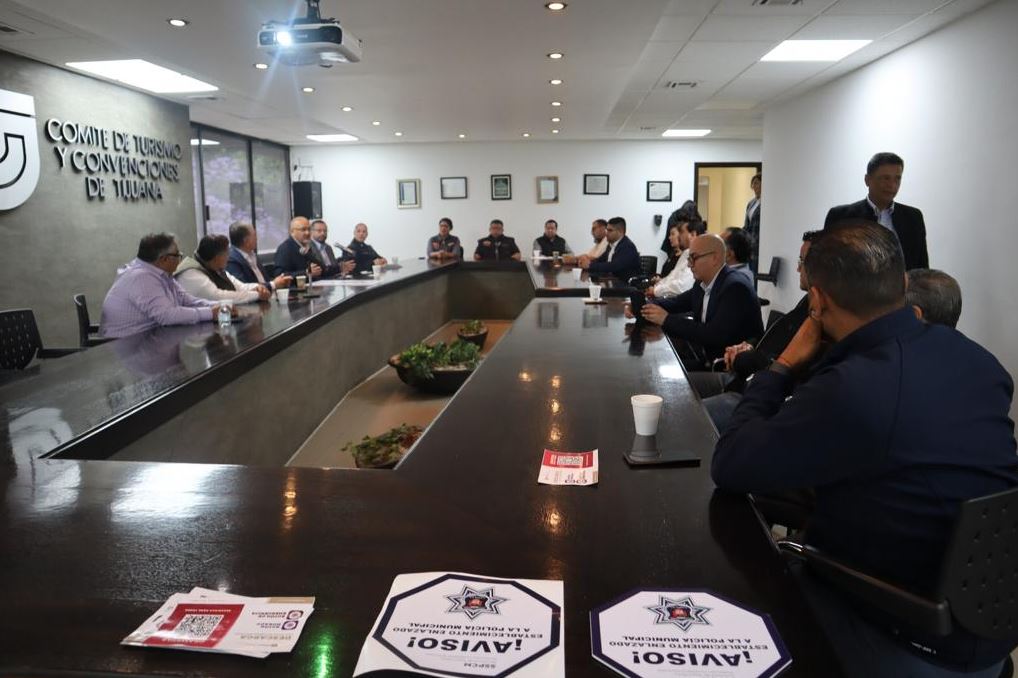 Con el propósito de sumar esfuerzos para la protección y asistencia de turistas y visitantes, el sector turístico, encabezado por el Lic. Arturo Gutiérrez Sánchez, sostuvo reunión con el Secretario de Seguridad y Protección Ciudadana Municipal, Fernando Sánchez González, en las instalaciones del Comité de Turismo y Convenciones de Tijuana.