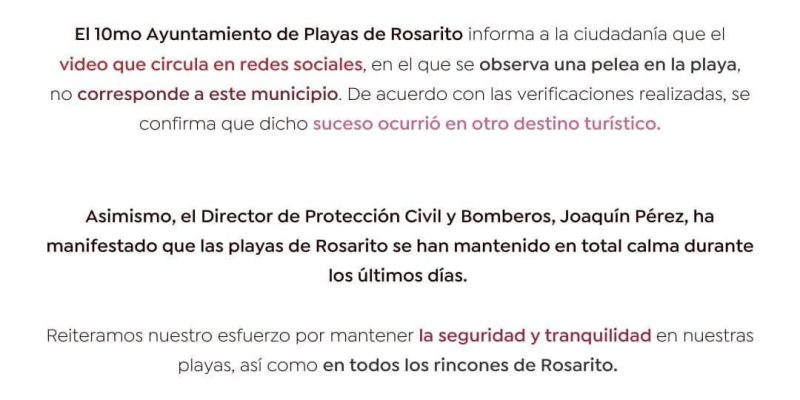 Lunes 24 de marzo de 2025.-El 10mo Ayuntamiento de Playas de Rosarito informa a la ciudadanía que el video que circula en redes sociales, en el que se observa una pelea en la playa, no corresponde a este municipio.