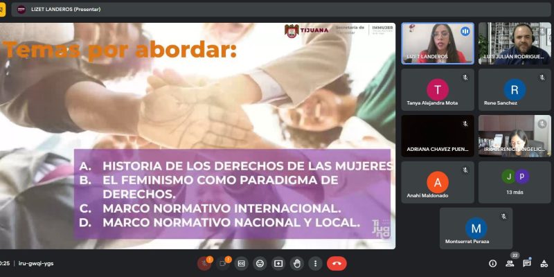 Tijuana, Baja California, a 18 de noviembre de 2023.- Con el objetivo de prevenir la violencia política en razón de género y fortalecer la cultura cívica, política y democrática, el XXIV Ayuntamiento de Tijuana encabezado por la alcaldesa Montserrat Caballero Ramírez, a través del Instituto Municipal de la Mujer (IMMUJER), impartió dos capacitaciones virtuales dirigidas a todo el personal del Instituto Estatal Electoral de Baja California (IEEBC).