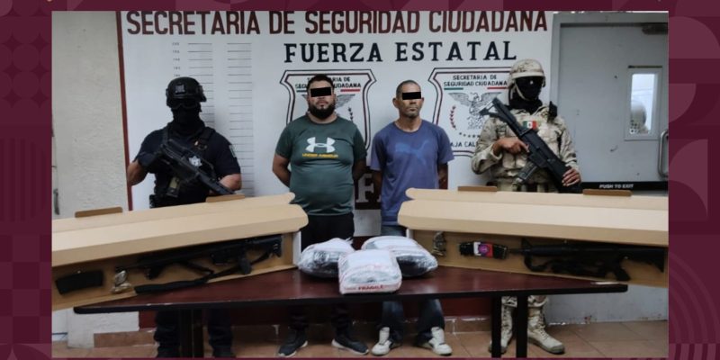 Eduin Alessandro “N”, de 31 años y Daniel “N”, de 43 años, los dos originarios del municipio de Mexicali, fueron descubiertos cuando realizaban labores de vigilancia y custodia frente a un domicilio ubicado sobre la calle Eulogio Sánchez, en el citado poblado.