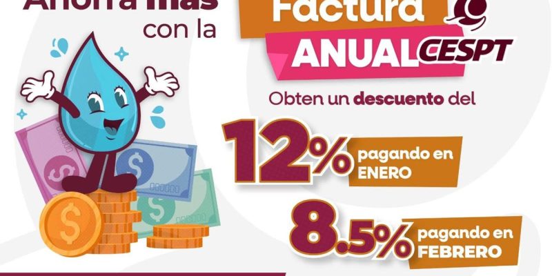 TIJUANA.- La Comisión Estatal de Servicios Públicos de Tijuana (CESPT), lanzó un llamado a todos los usuarios para que aprovechen la posibilidad descuentos en su servicio de agua, al realizar el pago anticipado de su factura. Pueden obtener un 12 por ciento de descuento durante enero y un 8.5 por ciento de descuento a quienes paguen en febrero, al realizar el pago anual, o gozar de un 5.5 por ciento de descuento en caso del pago anticipado semestral.