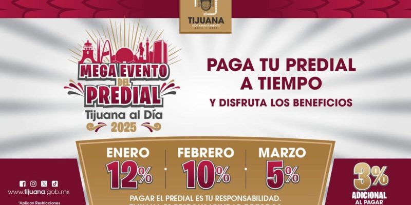 Tijuana, Baja California, 19 de enero de 2025.- El XXV Ayuntamiento de Tijuana, encabezado por el Presidente Municipal, Ismael Burgueño Ruiz, comprometido con el bienestar económico de las familias tijuanenses, invita a la ciudadanía a aprovechar un 3% de descuento adicional al realizar el pago del Impuesto Predial en línea, como parte del programa de estímulos fiscales del gobierno municipal.