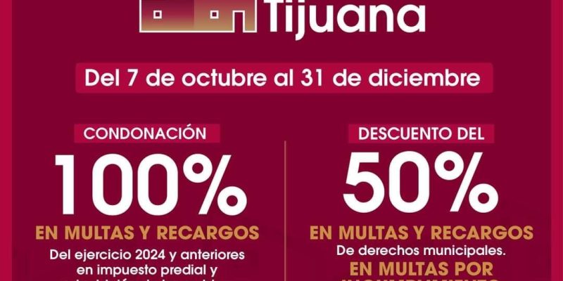 El acuerdo impulsado por el Presidente Municipal, Ismael Burgueño Ruiz, establece que durante su vigencia a las y los tijuanenses que realicen el pago del Impuesto Predial y del Impuesto Sobre Adquisición de Inmuebles, se les condonará el 100% de las multas y recargos generados por incumplimiento en su pago, respecto al ejercicio fiscal 2024 y años anteriores.