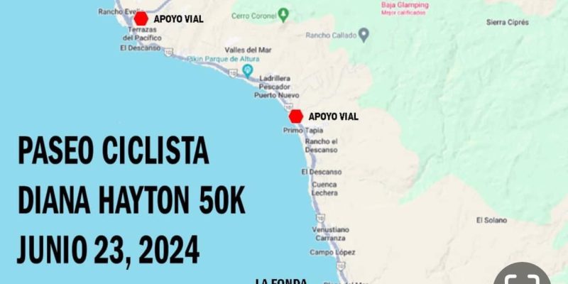 PLAYAS DE ROSARITO, B.C.- Martes 18 de Junio de 2024.- La Fundación Diana Miriam Hayton Sánchez y el Comité de Turismo y Convenciones (Cotuco) de Playas de Rosarito, invitan a la comunidad ciclista de Baja California y del Sur de California a participar en el “Paseo Diana Hayton 50K”, mismo que se realizará el próximo domingo 23 de junio, y al mismo tiempo apoyar a mujeres víctimas de violencia en la entidad.