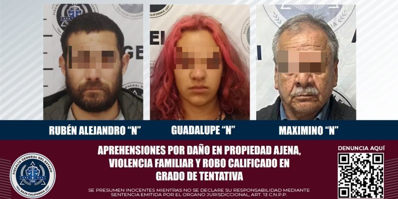 TIJUANA, BAJA CALIFORNIA, A 14 DE ABRIL DE 2024 – La Agencia Estatal de Investigación (AEI), de la Fiscalía General del Estado, ha logrado la captura de tres personas que contaban con órdenes de aprehensión, siendo una mujer y dos hombres.