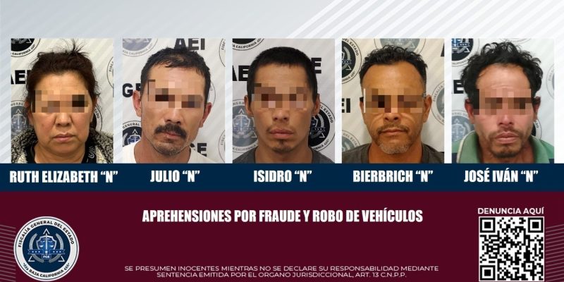 TIJUANA, BAJA CALIFORNIA A 6 DE MAYO DE 2024.- La Fiscalía General del Estado, por medio de sus agentes estatales de investigación de la Unidad de Aprehensiones, logró la detención de cinco imputados, en casos por separado, por los delitos de fraude y robo de vehículo.