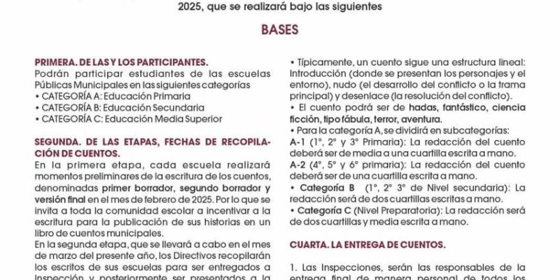 La dependencia municipal informó que en la primera etapa, cada escuela realizará fases preliminares de la escritura de cuentos, para obtener la versión final en el mes de febrero del presente año; en la segunda fase los directivos serán los encargados de recopilar los escritos de sus escuelas para entregar a Inspección y posteriormente serán presentados a la Secretaría de Educación Pública Municipal.