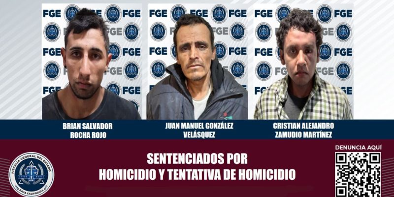 TIJUANA, BAJA CALIFORNIA, A 27 DE JUNIO DE 2023.- Derivado de una coordinada y efectiva investigación penal por parte del agente del Ministerio Público, agentes estatales de investigación y peritos expertos en sus respectivas áreas, la Fiscalía General del Estado obtuvo una sentencia de 56 años y 3 meses de prisión para tres hombres que fueron encontrados culpables del delito de homicidio calificado con ventaja y homicidio calificado con ventaja en grado de tentativa.