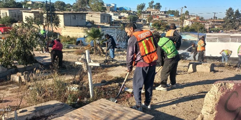 Tijuana, Baja California, 31 de octubre de 2023.- El XXIV Ayuntamiento de Tijuana, encabezado por la alcaldesa Montserrat Caballero Ramírez, reforzó los trabajos de mantenimiento y rehabilitación en los 13 panteones municipales, con el objetivo de brindar un servicio óptimo a los visitantes durante la conmemoración por el Día de Muertos.