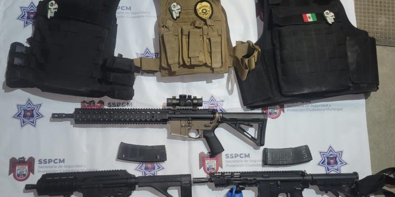 En el vehículo se encontraron tres armas largas, una calibre 5.56, otra .223 y una más calibre 9X19 mm, además de cargadores, cartuchos y tres chalecos balísticos.
