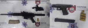 A dichos sujetos les fueron decomisadas un arma tipo pistola calibre 9 milímetros abastecida con 19 cartuchos útiles y un arma larga con tres cartuchos útiles, asimismo, en el lugar fueron asegurados tres vehículos, de los cuales dos contaban con reporte de robo.
