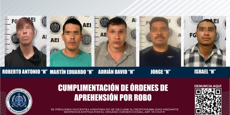 TIJUANA, BAJA CALIFORNIA, A 17 DE OCTUBRE DE 2023.- Como resultado de información recabada en gabinete y campo, a cinco hombres se les cumplimentó orden de aprehensión en Tijuana por el delito de robo. Elementos de la Fiscalía General del Estado los pusieron a disposición de un juez para que respondan por el ilícito que se les imputa.