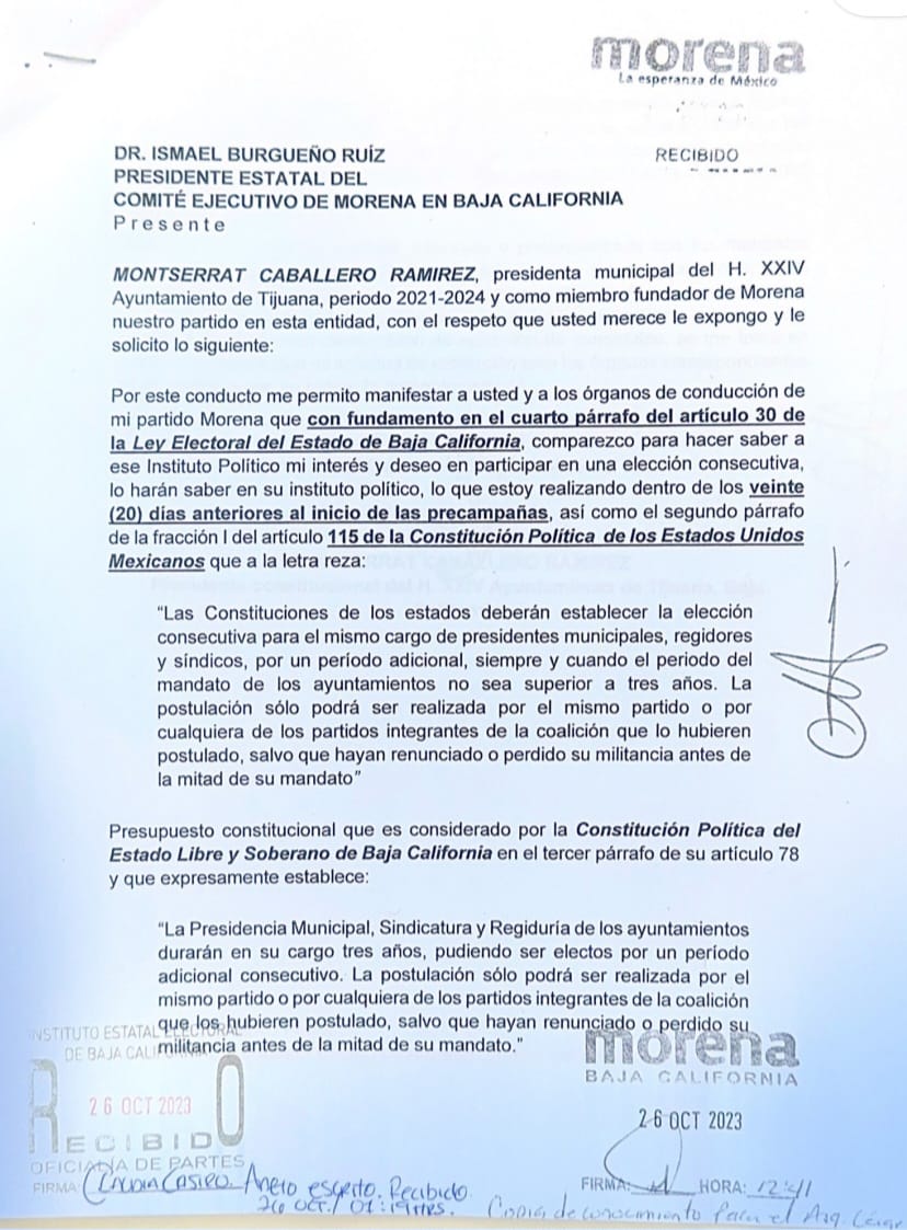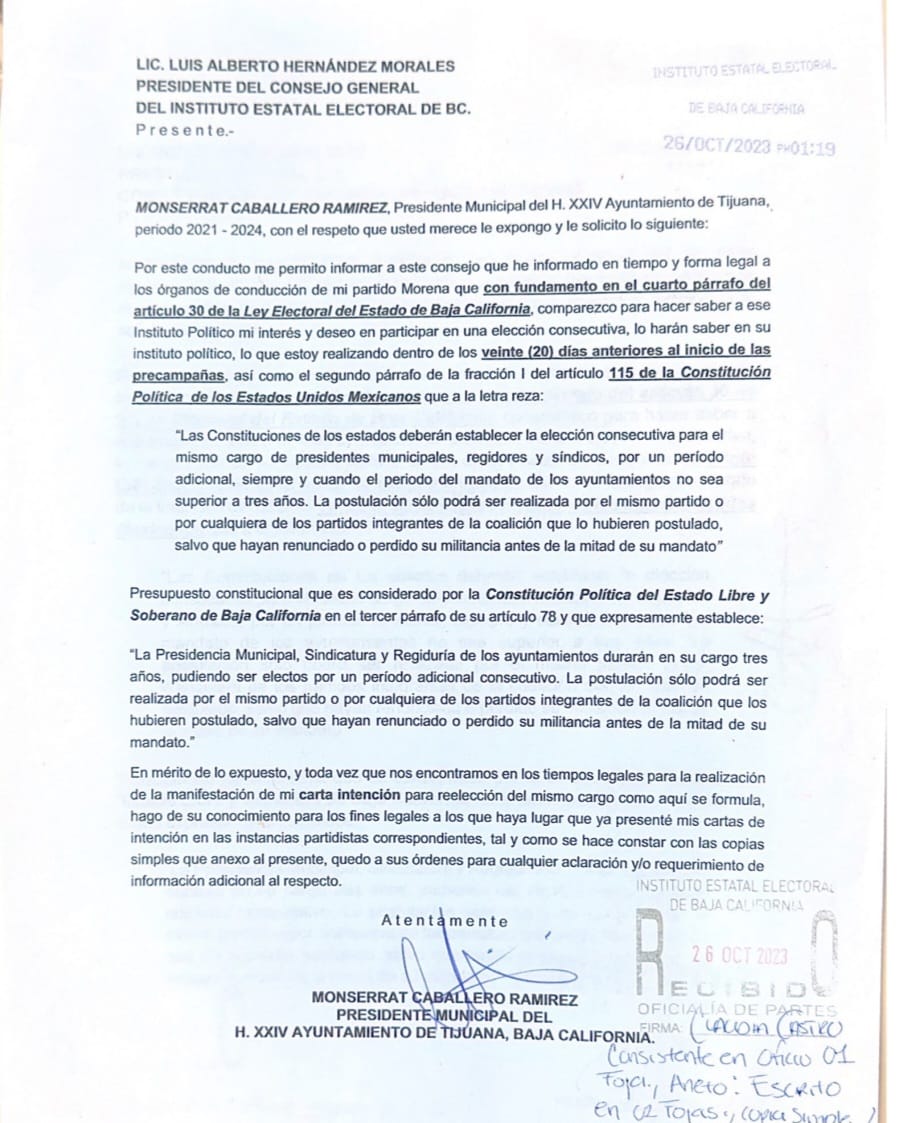 TIJUANA.- La presidenta municipal, Monserrat Caballero Ramírez, presentó ante el Instituto Estatal Electoral de Baja California (IEEBC) y Morena su intención por buscar la reelección y participar en el proceso interno de su partido, de cara a los comicios de junio de 2024.