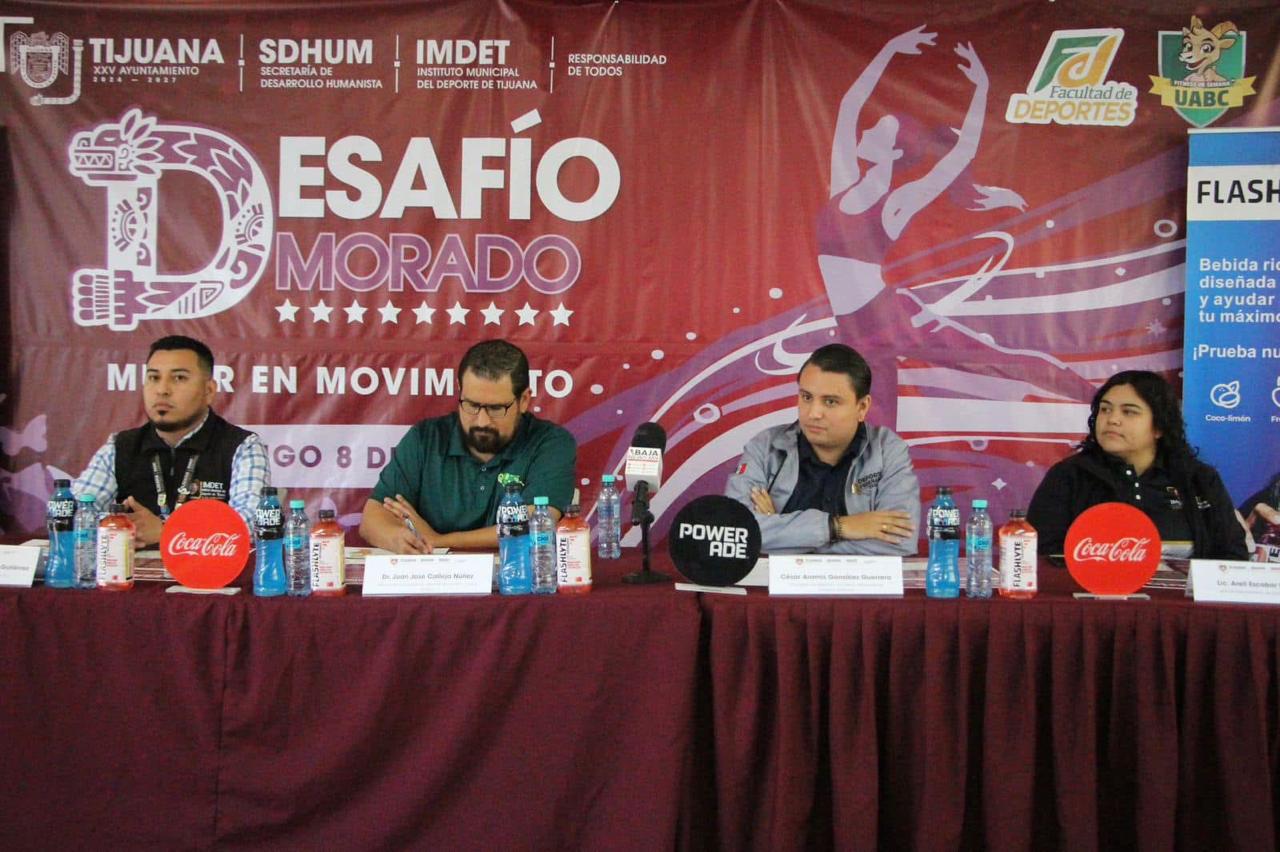 TIJUANA, B.C., a 3 de marzo de 2026 . – El XXV Ayuntamiento de Tijuana, a través de la Secretaría de Desarrollo Humanista y el Instituto Municipal del Deporte (IMDET), presentó ante medios de comunicación el evento Desafío Morado 2026: Corre, Camina, Trota y Mujer en Movimiento, que se llevará a cabo el próximo domingo 8 de marzo.