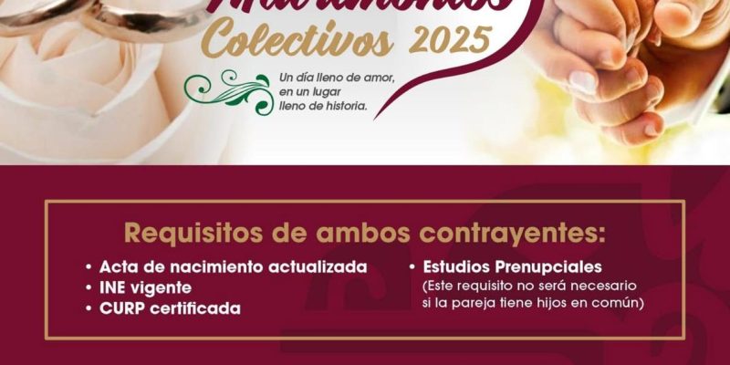 Los requisitos que deben cumplir las parejas sonː presentar acta de nacimiento actualizada de ambos contrayentes, identificaciones oficiales vigentes, CURP certificada, así como estudios prenupciales, mismo que se exenta en caso de tener hijos en común, en su lugar deberá acompañar el expediente con el acta de nacimiento de uno de sus hijos.