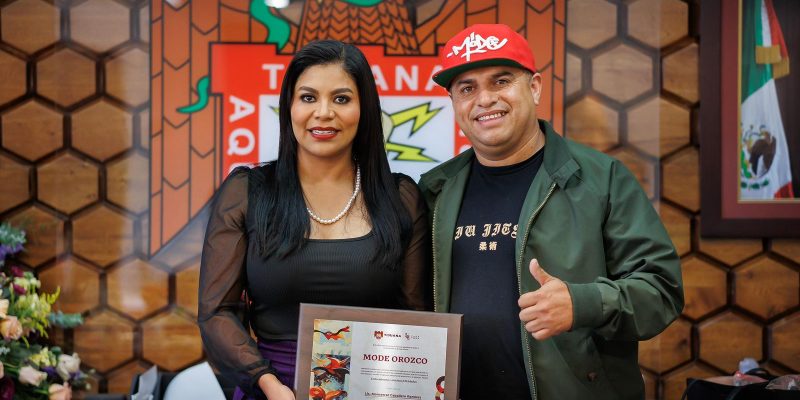 Tijuana, Baja California, a 21 de mayo de 2024.- La alcaldesa Montserrat Caballero Ramírez entregó un reconocimiento al artista urbano Mode Orozco, por contribuir a la transformación y embellecimiento de Tijuana con su trabajo y talento, plasmado en más de treinta murales realizados por él en distintos puntos de la ciudad.