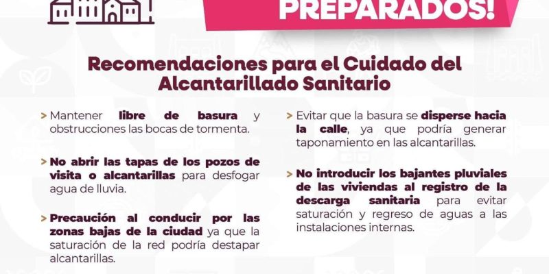 Además, dijo que se han identificado varias medidas preventivas que la población puede adoptar para reducir el riesgo de encharcamientos y desbordamientos en el sistema de alcantarillado sanitario, por lo que hizo un llamado a seguir las siguientes recomendaciones: