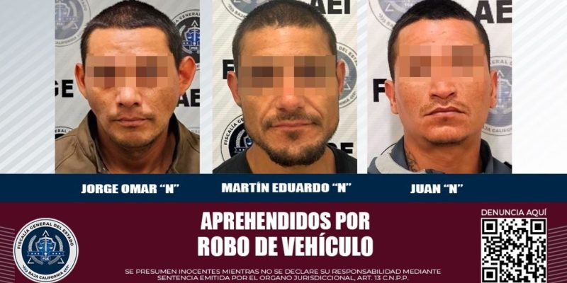 TIJUANA, BAJA CALIFORNIA, A 3 DE JULIO DE 2023.- En diligencias realizadas por elementos de la Fiscalía General del Estado, a través de la Agencia Estatal de Investigación (AEI), se logró la cumplimentación de tres órdenes de aprehensión, en contra de igual número de personas, que son investigadas, en casos por separado, por robo de vehículo.