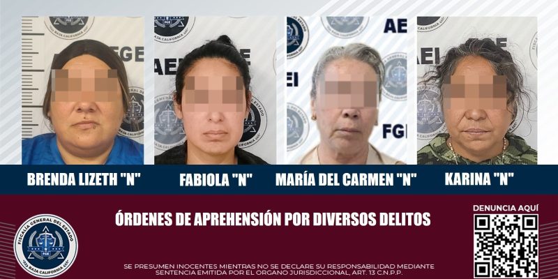 TIJUANA, BAJA CALIFORNIA, A 13 DE JULIO DE 2024.- La Agencia Estatal de Investigación ejecutó mandatos judiciales contra cuatro mujeres que se encontraban prófugas de la justicia.
