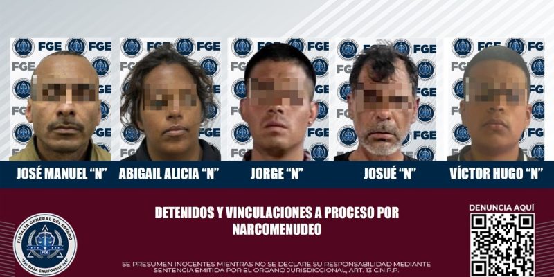 IJUANA, BAJA CALIFORNIA, A 1 DE JUNIO DE 2024.- Agentes de la Fiscalía Especializada en Narcomenudeo, detuvieron a dos personas durante un cateo. Asimismo, tres imputados por delitos contra la salud fueron vinculados a proceso penal.
