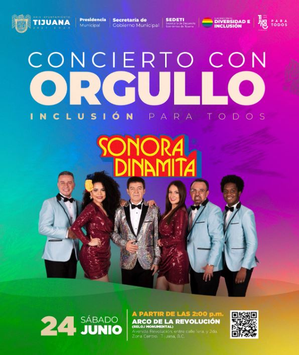 Tijuana, Baja California, 21 de junio de 2023.- El Ayuntamiento de Tijuana, encabezado por la alcaldesa Montserrat Caballero Ramírez, invita a la ciudadanía “Concierto con Orgullo, Inclusión para Todos”, para este sábado 24 de junio, con la presentación especial de la Sonora Dinamita.