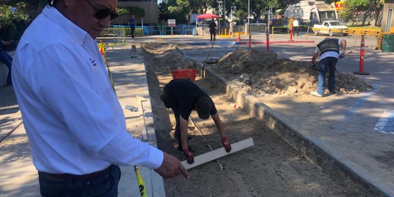 Óscar Montes de Oca, Regidor del 24 Ayuntamiento de Tijuana, supervisa las obras de reacondicionamiento de los accesos para discapacitados, en Palacio Municipal.