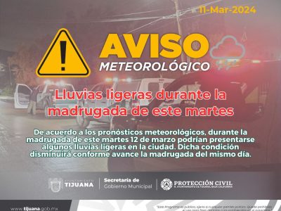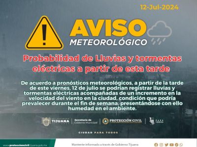 Emite XXV Ayuntamiento de Tijuana recomendaciones ante posible llegada de tormenta eléctrica para este jueves