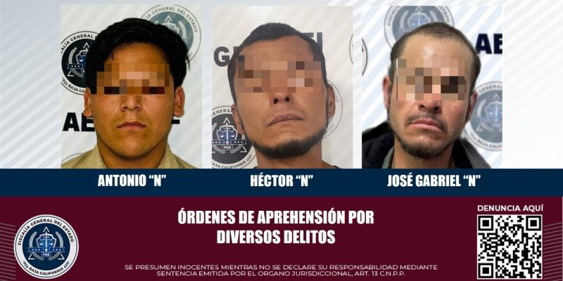 TIJUANA, BAJA CALIFORNIA, A 2 DE JULIO DE 2024 – La Fiscalía General de Baja California, a través de la Agencia Estatal de Investigación, aprehendió a tres prófugos de la justicia por diferentes delitos. Estos sujetos contaban con mandatos judiciales por violación, daño en propiedad ajena y lesiones por culpa, respectivamente, y fueron puestos a disposición de las autoridades judiciales correspondientes.